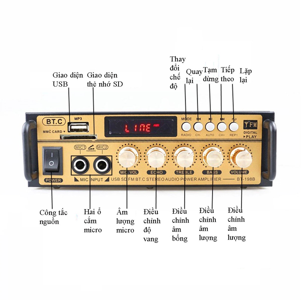 - Kết nối âm thanh qua Bluetooth, đọc trực tiếp usb, thẻ nhớ micro SD, đài FM