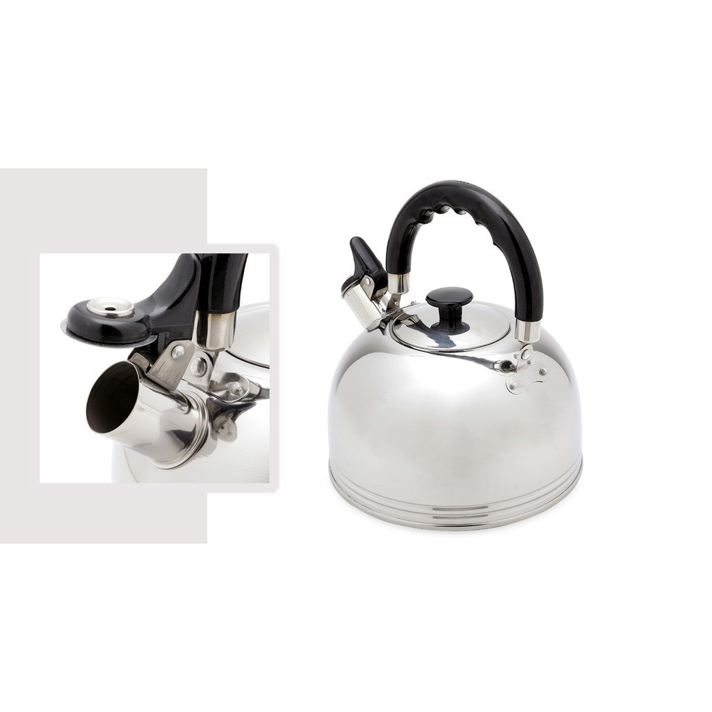 Vòi rót có nắp đậy kín tăng khả năng giữ nhiệt và ngăn ngừa bụi bẩn, vi khuẩn xâm nhập. Dung tích lớn 2,5L giúp đun được nhiều nước hơn, tiết kiệm thời gian và công sức hiệu quả. Ấm có còi báo hiệu khi nước sôi của ấm sẽ giúp bạn chủ động hơn trong việc tắt bếp, hạn chế những sự cố như tràn hoặc cạn nước.Tay cầm của sản phẩm có thể gấp gọn, thuận tiện cho việc bảo quản và cất giữ ấm khi không dùng đến. Phần quai cầm, nắp vòi và núm nắp được làm từ nhựa với khả năng cách nhiệt tốt, hạn chế nóng, bỏng khi cầm.