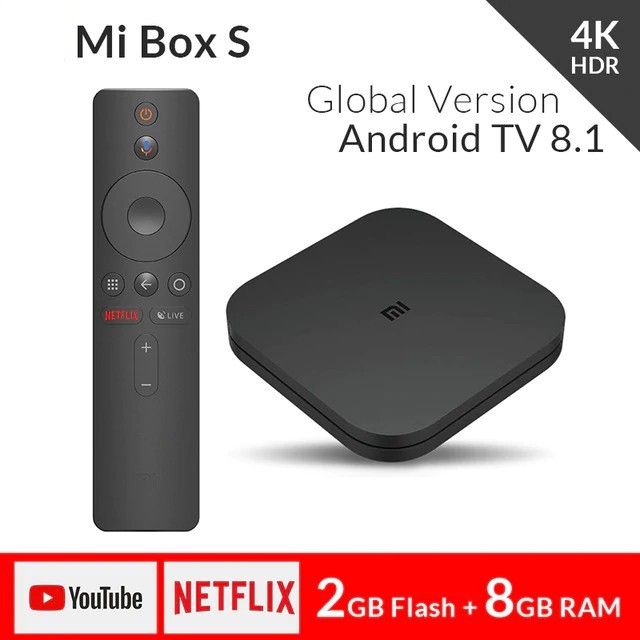 - Về phần cứng, Mi Box S nặng chỉ 147g, trang bị CPU 4 nhân, GPU 3+2 nhân, bộ nhớ trong 8GB và hệ điều hành Android TV (phiên bản 8.1 Oreo).