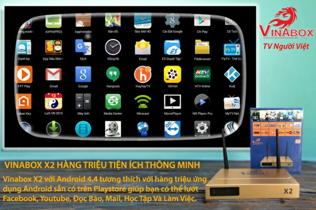 Vinabox X2 được tích hợp đầy đủ các kho phim HDplay, KODI ITVPLUS, HDviet, Các kho truyền hình... hơn 26 ứng dụng được tích hợp.