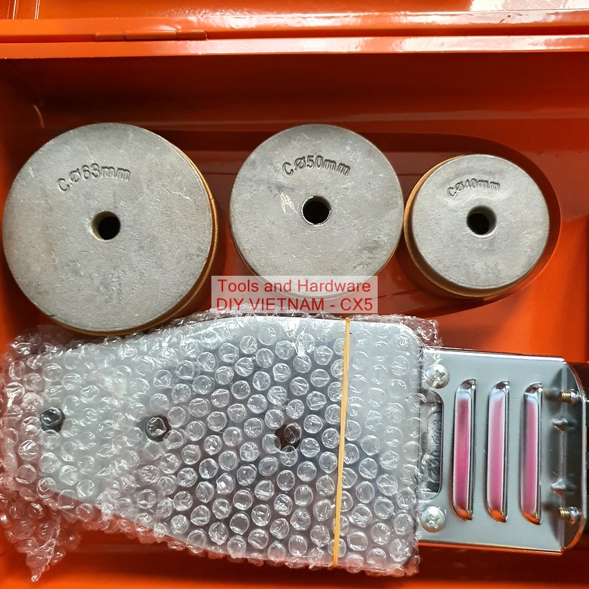 • Phụ kiện kèm theo Máy hàn ống nhiệt PPR: Hộp đựng bằng kim loại, Thân máy,chân giá đỡ máy, ốc nối đầu hàn, 6 đầu hàn phi cho loại từ 20-25-32-40-50-63mm