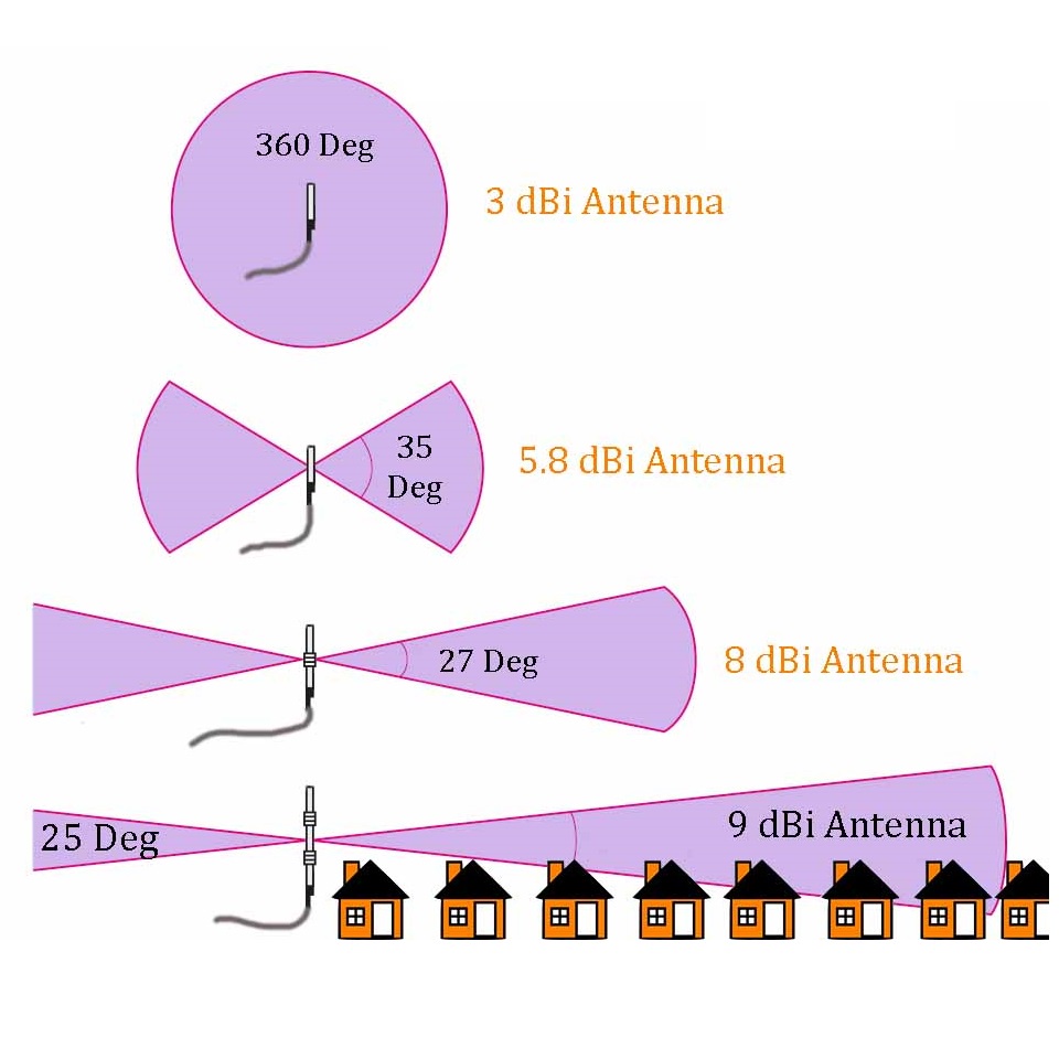 - Anten càng ngắn (dBI càng bé) -> phát càng ngắn, càng ít vùng chết (do sóng tỏa rộng hơn nhưng ko xa bằng)