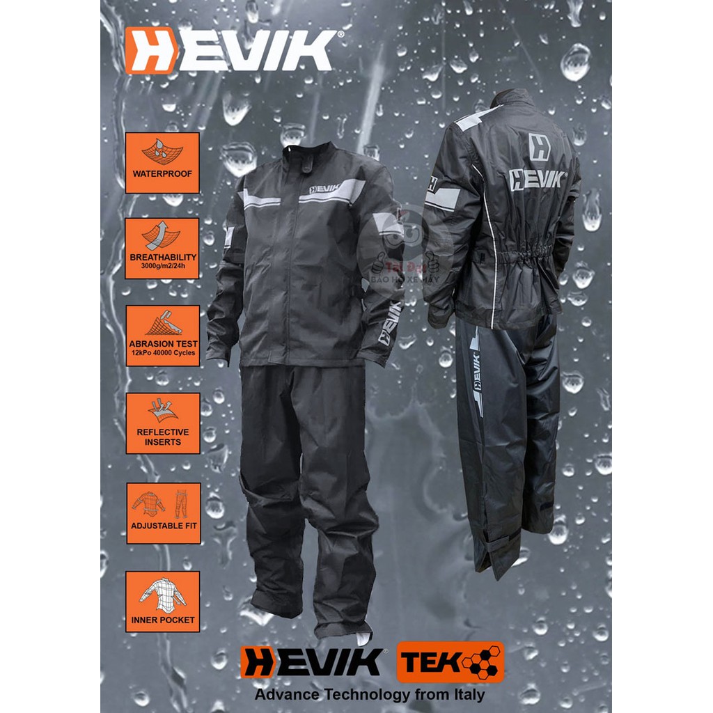 Áo mưa bộ đi phượt Hevik Tek dành cho người đi xe máy đường xa, chống mưa, nắng tốt. Đây là một sản phẩm mới nữa từ thương hiệu Ý mới ra mắt năm 2019 - HEVIK.Với thiết kế mang từ người Ý - form chuẩn Âu, hợp thời trang, màu đen đỡ dơ, mẫu Hevik Tek còn được may 2 lớp: lớp ngoài chống thấm 100%, lớp bên trong vải lưới thoáng mát.