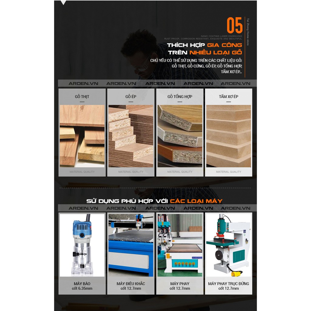 ✅ Sử dụng được hầu hết mọi loại gỗ : gỗ thịt , ván ép , ván dăm , MDF,….