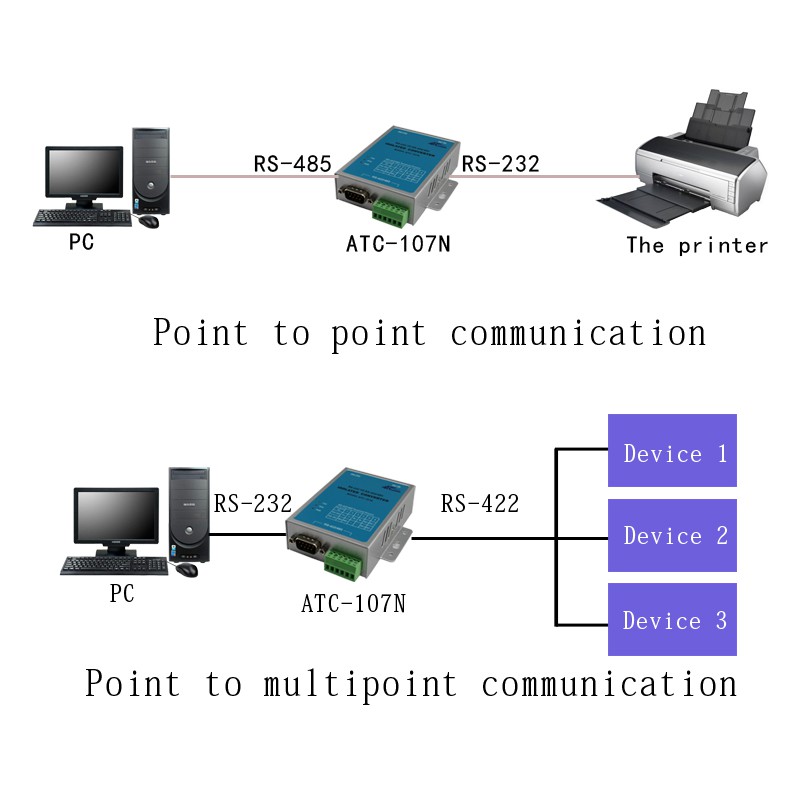 ATC-107N: Bộ chuyển đổi RS232 sang RS485/422 hỗ trợ cách ly quangATC-107N: Bộ chuyển đổi tín hiệu từ RS232 sang RS485/RS422 tương thích chuẩn cổng vật lý RS232C, RS485, RS422 và khả năng cân bằng tín hiệu khi chuyển đổi từ RS232 sang RS485 hoặc RS422. ATC-107N cung cấp giải pháp kết nối truyền thông theo mô hình điểm-điểm (Point to Point), điểm-nhiều điểm (Point to Multipoint). Đặc biệt, kết nối điểm-nhiều điểm cho phép kết nối tới 256 điểm RS485/RS422 với tốc độ từ 0-115.2kbps. ATC-107N được thiết kế theo tiêu chuẩn công nghiệp, nhỏ gọn, dễ dàng lấy được tín hiệu về PLC, máy tính, vi xử lý, máy tính nhúng. Sản phẩm hiện đang được sử dụng trong các ứng dụng IoT, M2M của các lĩnh vực: Điện lực, khí tượng thủy văn, giao thông thông minh…
