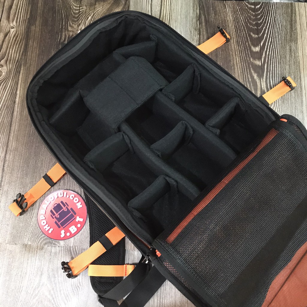 - Sức chứa ngăn chính cho camera với 2 body+ 5 lens + flash và nhiều phụ kiện đi kèm. Thiết kế balo có thể dựng được laptop 13 đến 15,6 inch