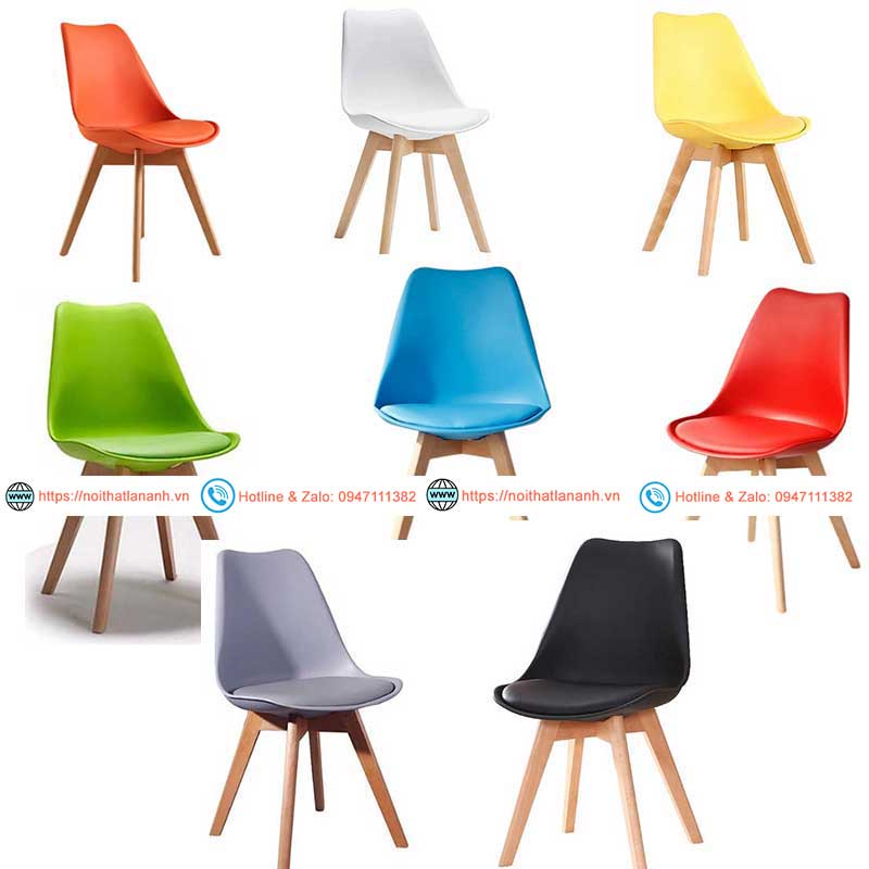 Ghế chất liệu: nhựa PP đúc nguyên khối, nệm simili, chân gỗ beech tự nhiên to và cực kỳ chắc chắn.