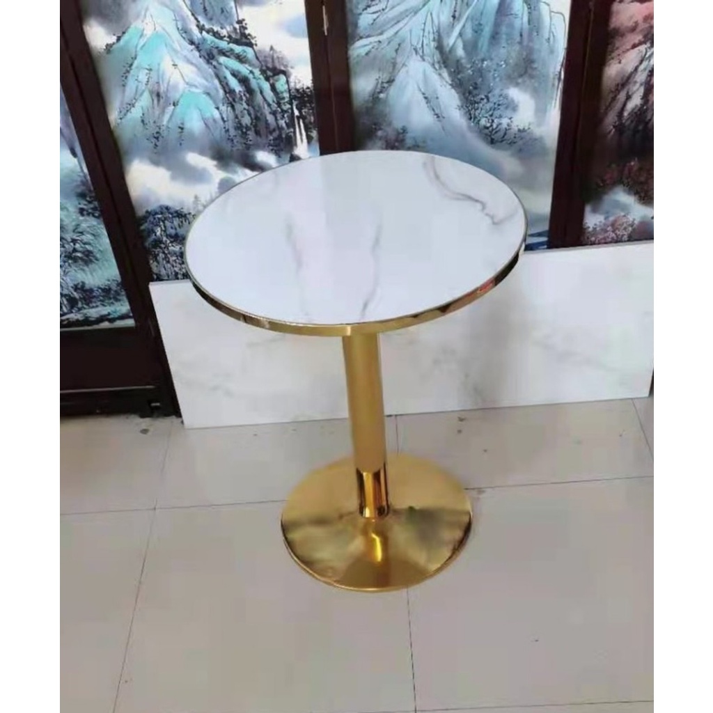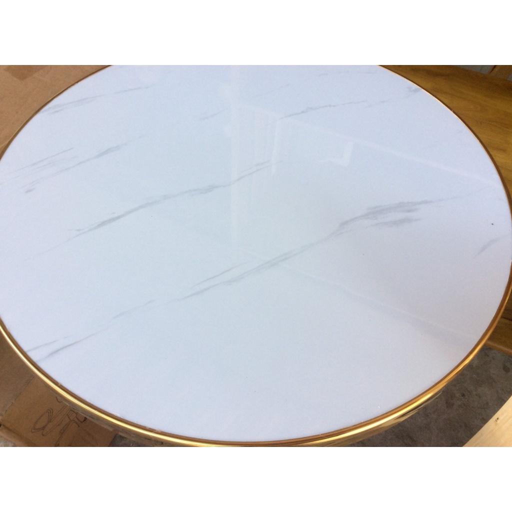Chất liệu: Chân sắt mạ vàng, Mặt bàn đá gốm viền vàng.