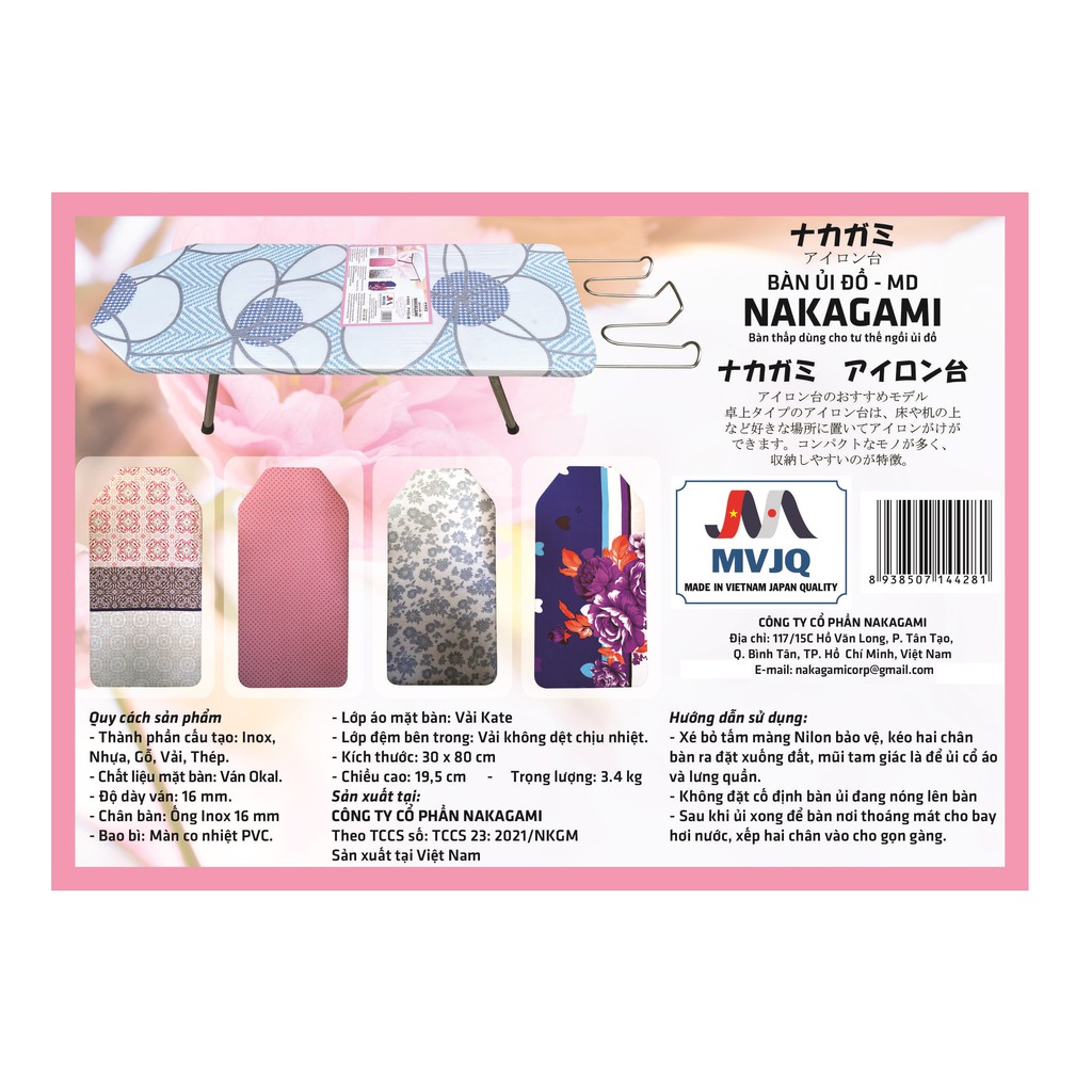Bàn ủi đồ Nakagami có giá đỡ Chính hãng Chất lượng công nghệ Nhật Bản.Thành phần cấu tạo: Inox, nhựa, gỗ, vải chịu nhiệt, thép