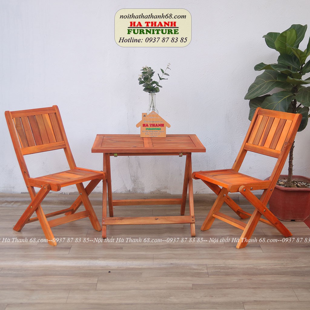 Bàn ghế ban công mini gấp gọn phù hợp diện tích ban công vừa và nhỏ.Các tiêu trí đặt ra cho 1 chiếc ghế cafe ngoài trời- bàn ghế ban công là thích ứng được với thời tiết, chống thấm tốt, độ bền cao và đảm bảo tính thẩm mỹ. Đừng lo Chúng tôi đã có giải pháp cho bạn! Nội thất Hà Thanh 68 xin giới thiệu bộ bàn ghếmini gỗ tràm xếp gọn là lựa chọn lý tưởng cho không gian ngoài trời.