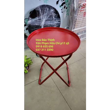Khung bàn sắt cao 52cm và mặt bàn dạng khay đĩa sắt tròn đường kính 42cm.