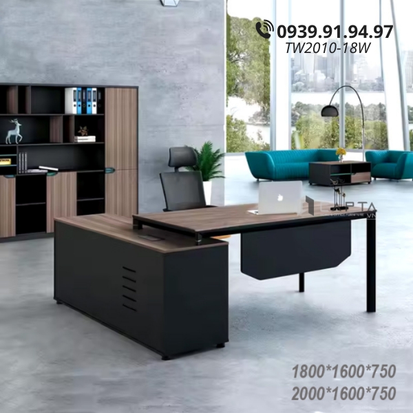 Bàn có thiết kế hiện đại TW2010-18W có kèm tủ phụ giúp các vị lãnh đạo, ban giám đốc có không gian ngồi làm việc rộng rãi, lưu trữ các đồ dùng, tài liệu và hồ sơ tạo sự tiện nghi từ đó tăng năng suất làm việc. Tủ phụ liền bàn chính được làm từ gỗ MFC màu đen cổ điển, kích thước rộng rãi với chiều dài tủ 1m6.