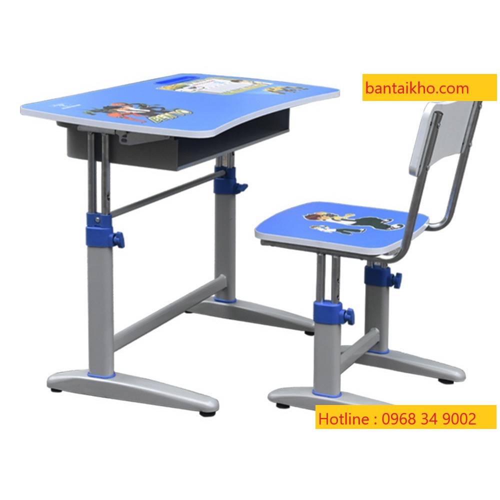 Bộ bàn ghế học sinh khung thép, mặt bàn bằng gỗ melamine in hình con giống.Ghế khung thép sơn dùng đệm tựa gỗ melamine.