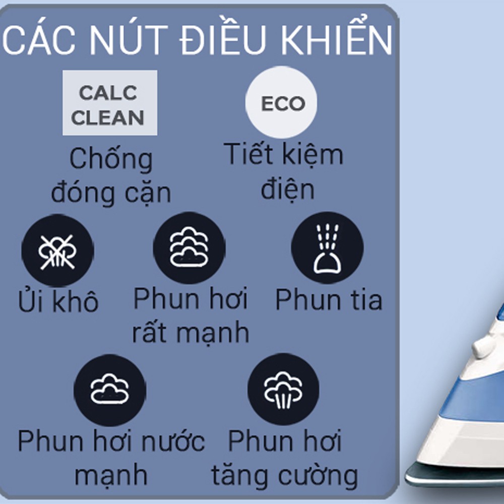 Chức năng: Ủi khô, Ủi hơi nước, Phun tia, Phun hơi tăng cường, Phun hơi thẳng đứng