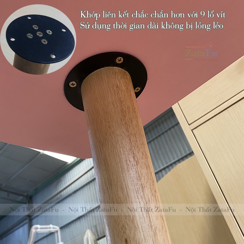 - Chân gỗ sử dụng pat sắt với 8 lổ vít chắc chắn (không dùng loại có trục sắt xoắn ốc, vì dùng thời gian dài sẽ bị mòn xoắn ốc khiến bàn bị bập bênh)