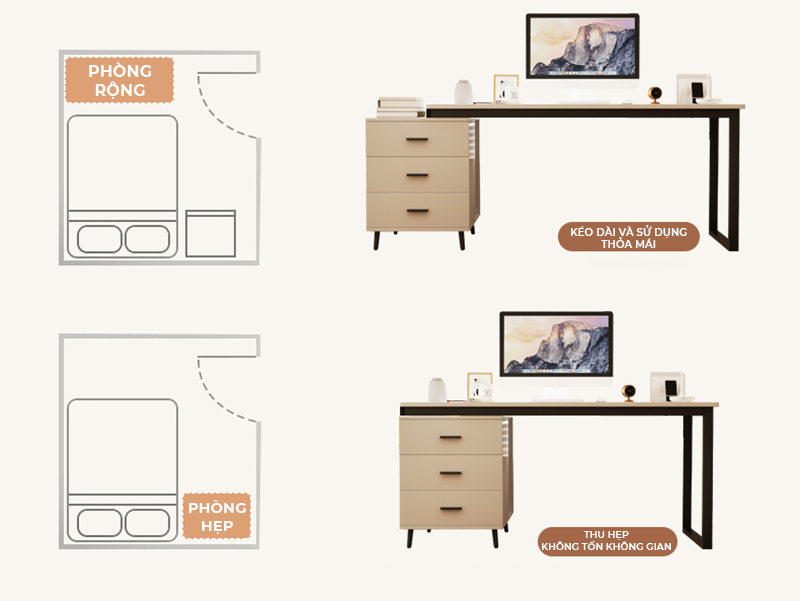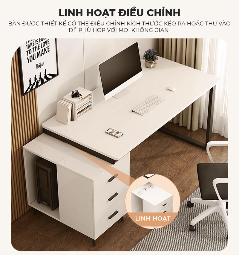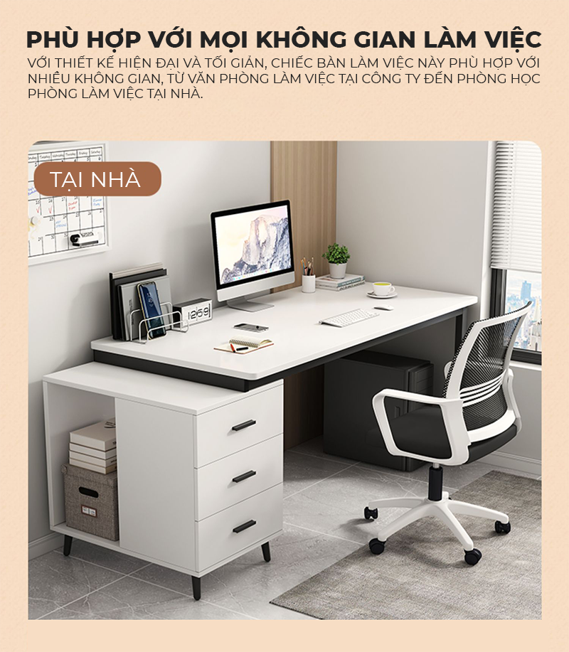 - Công năng: Là mẫu bàn làm việc có thiết kế hiện đại kèm tủ hồ sơ đa năng phù hợp tại nhà và cả văn phòng làm việc