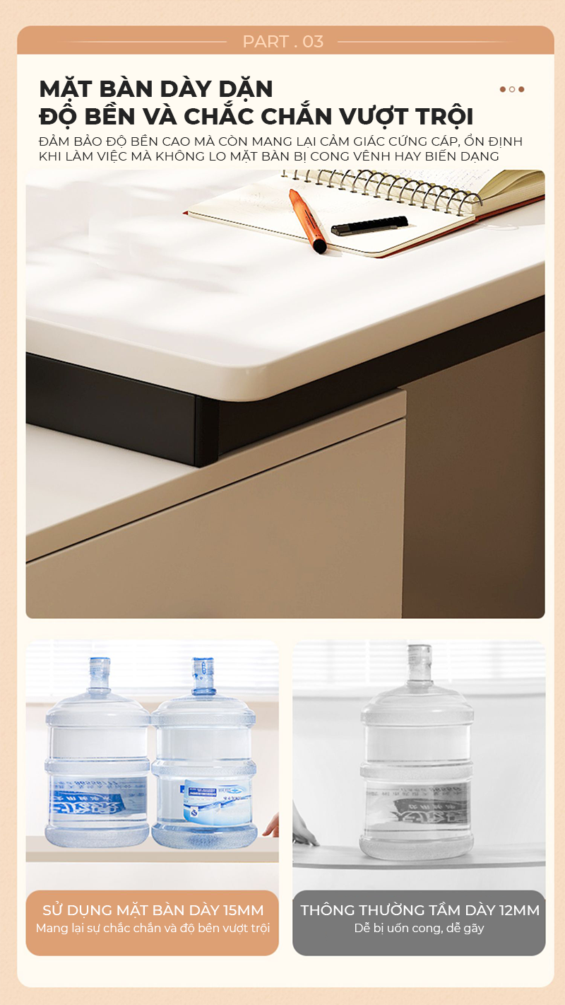 - Chất liệu: Mặt bàn gỗ mdf dày 30mm phủ melamin chống xước - Khung thép chống gỉ phủ sơn tĩnh điện