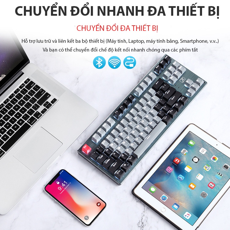 Bàn phím cơ Bluetooth Coputa Bàn phím máy tính không dây kết nối điện thoại LED trắng TKL XM87 có thể kết nối vói nhiều loại thiết bị như điện thoại, máy tính bảng, PC, laptop... Giúp sử dụng thuận tiện hơn.