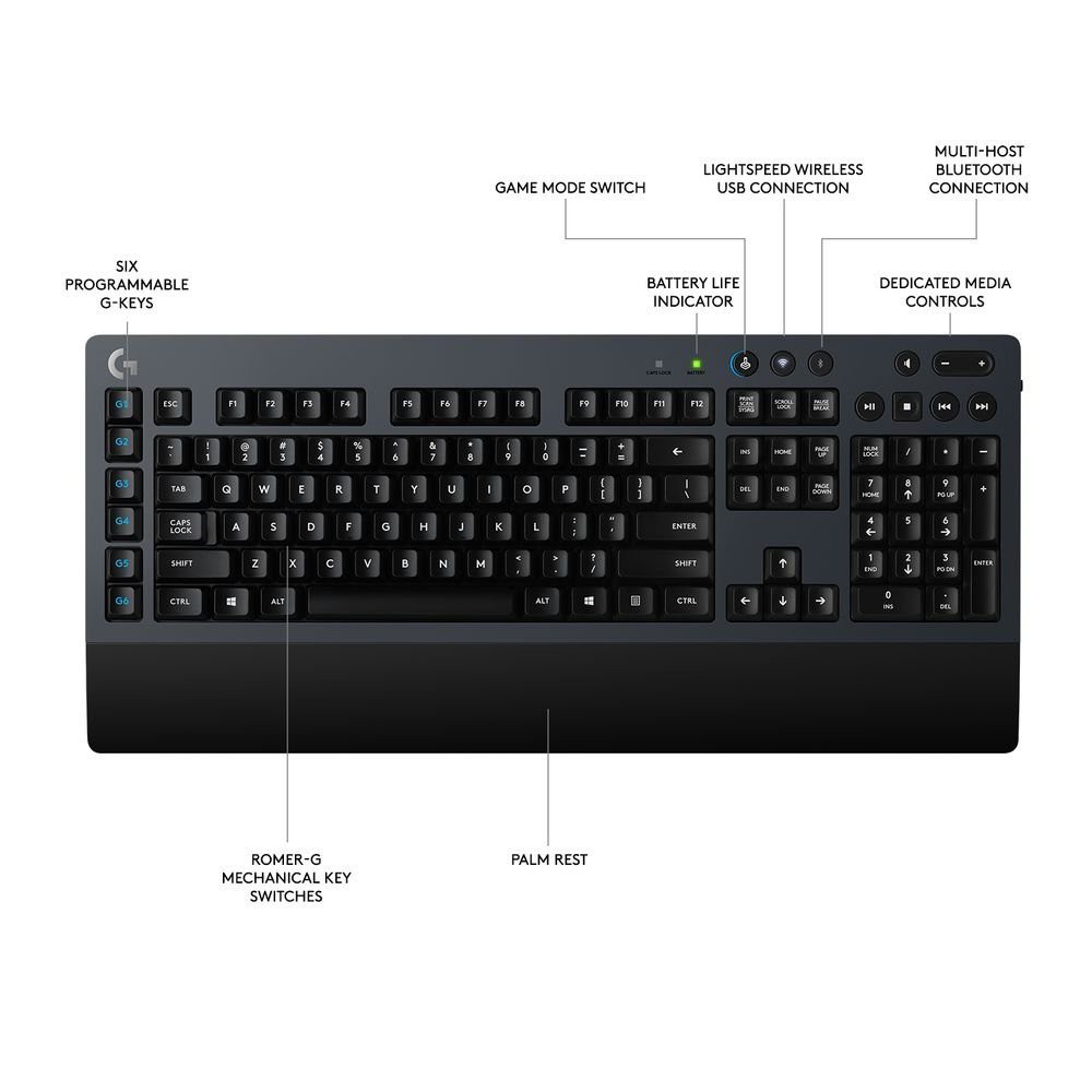 G613 có công nghệ không dây LIGHTSPEED™ cho tốc độ báo cáo siêu nhanh 1ms và Bluetooth® để kết nối nhiều máy chủ, hiệu suất cơ học Romer-G tiên tiến, 6 phím G có thể lập trình và thời gian sử dụng pin đáng ngạc nhiên.