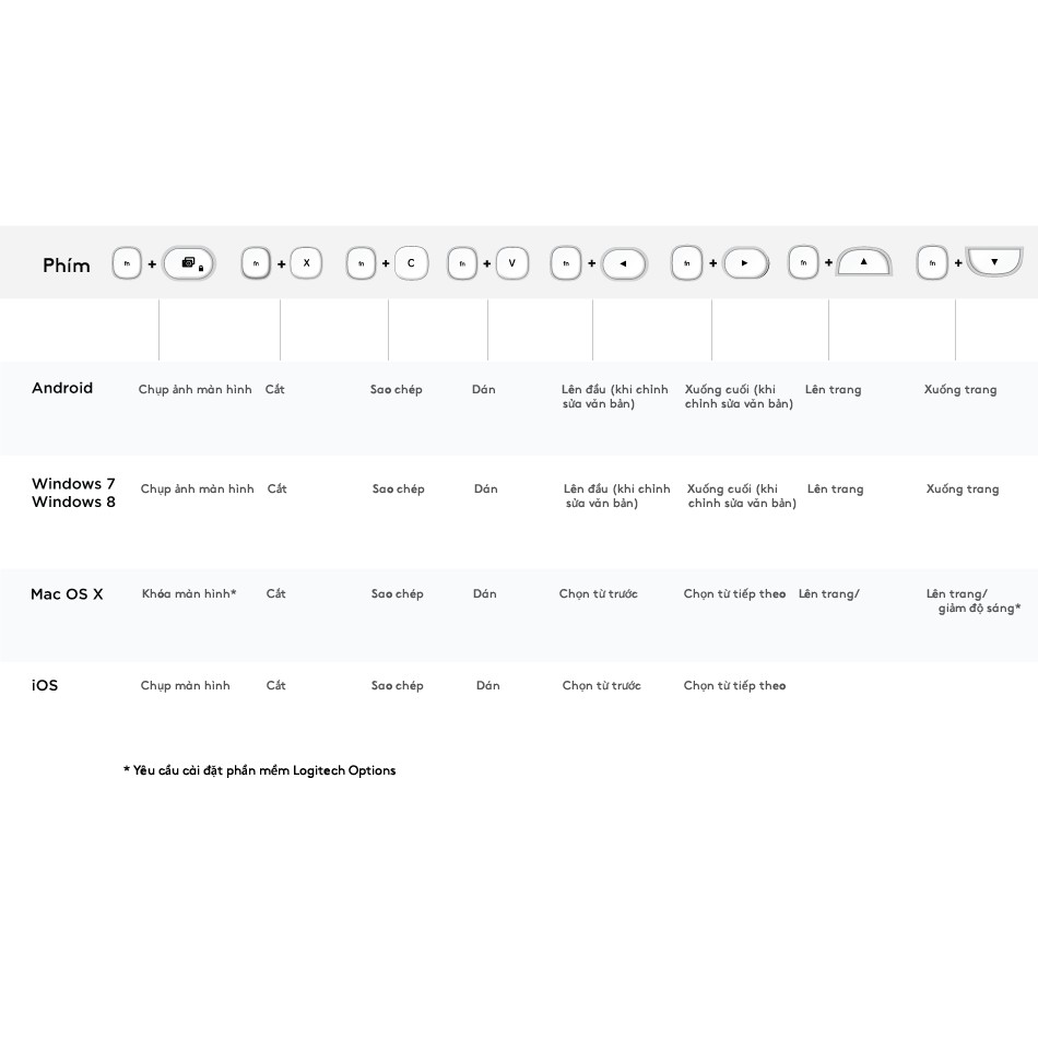 - Bằng việc chuyển đổi nhanh lên đến 3 thiết bị, bàn phím này hỗ trợ cho người dùng Windows, Android, Chrome OS, iOS, OS X chuyển đổi qua lại nhanh chóng, sử dụng các phím lệnh phù hợp và không cần những thiết lập phức tạp.