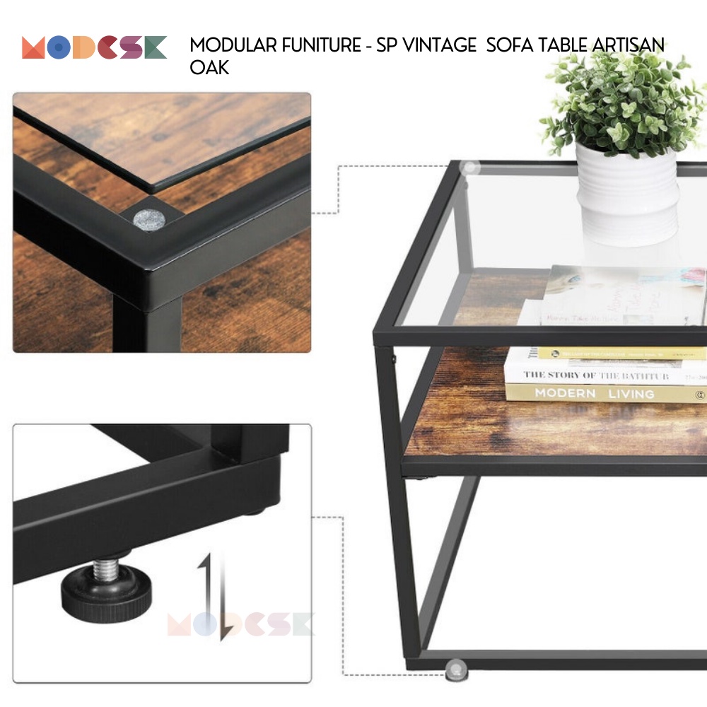 Giới thiệu Bàn sofa dài MODESK SP Vintage Sofa Table Artisan Oak Khung Sắt Sơn Tĩnh Điện - Ván Gỗ MFC Kính Cường Lực