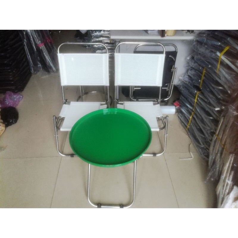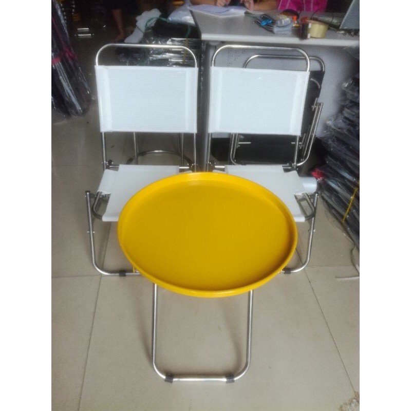 Mặt bàn: sắt sơn tĩnh điện, bán kính 43cm.Chân bàn: ống inox 16 dày 6 zem.