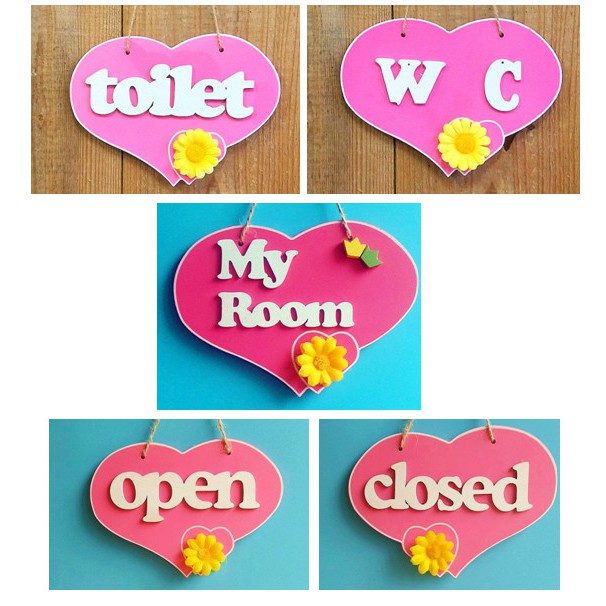 Bảng hiệu hình trái tim màu hồng WC, TOILET, MYROOM, OPEN CLOSE