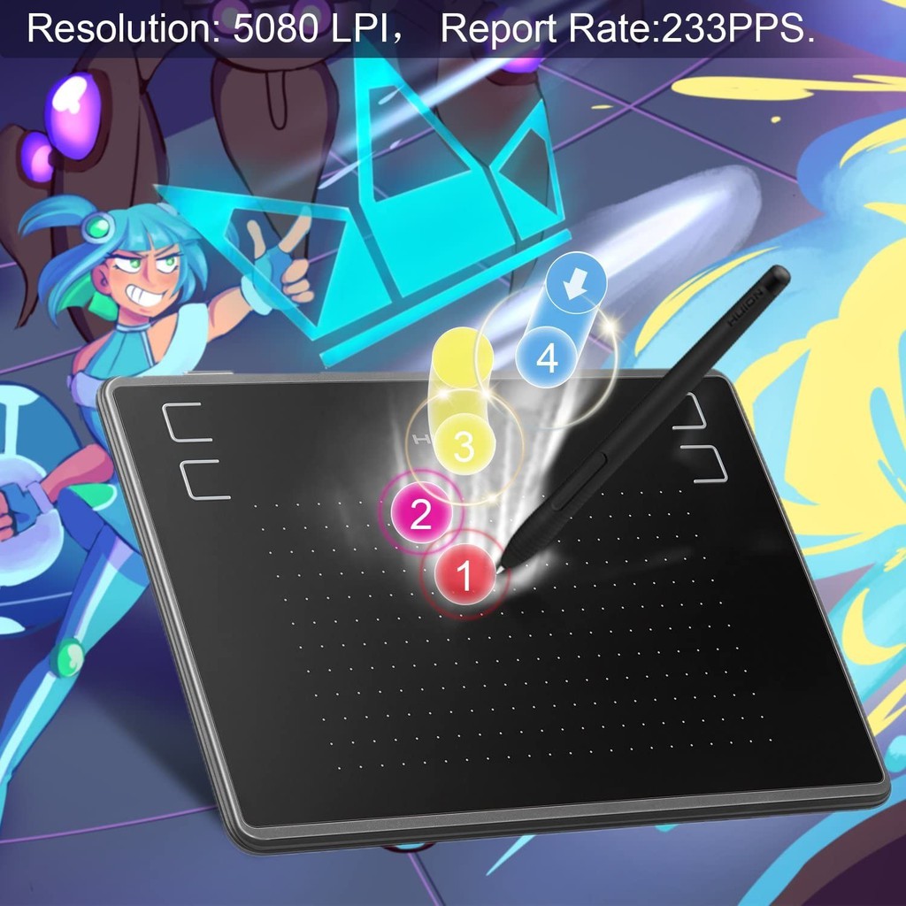 - Với tốc độ truyền dữ liệu 233pps, độ phân giải bảng vẽ 5080lpi, và đặc biệt 4096 mức cảm ứng lực nhấn, Huion H430P mang đến hiệu năng hoạt động mạnh mẽ và xuất sắc trên nhiều công việc khác nhau