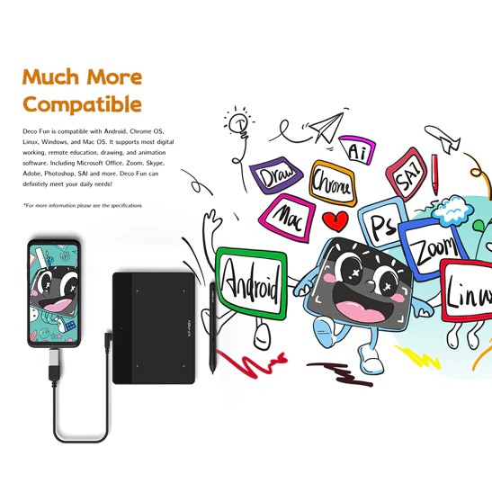 DECO VUI LÀ TƯƠNG THÍCH VỚI HỆ ĐIỀU HÀNH ANDROID, CHROME OS, LINUX, WINDOWS VÀ MAC OS. NÓ HỖ TRỢ HẦU HẾT CÁC KỸ THUẬT SỐ LÀM VIỆC, TỪ XA GIÁO DỤC, VẼ, VÀ PHẦN MỀM HOẠT HÌNH. BAO GỒM CẢ MICROSOFT OFFICE, ZOOM, SKYPE,, ADOBE PHOTOSHOP, SAI VÀ NHIỀU HƠN NỮA. DECO VUI VẺ CHẮC CHẮN CÓ THỂ ĐÁP ỨNG NHU CẦU HÀNG NGÀY CỦA BẠN!