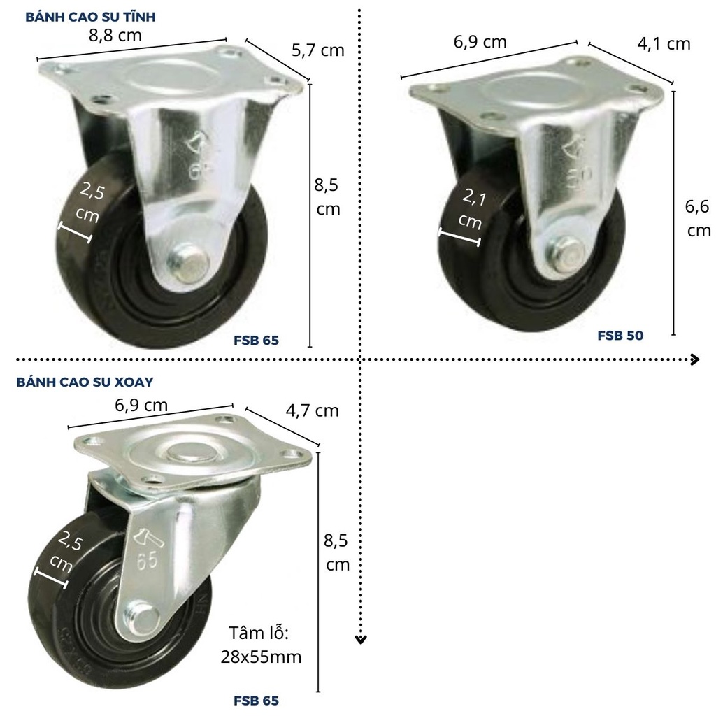 Gồm các loại: Bánh cao su cố định, cao su xoay, cao su xoay có khóa, cao su vít khóa.