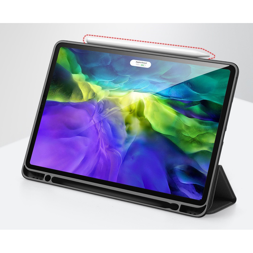 - Chất liệu nhựa TPU và vải độc đáo, lạ mắt, thân thiện với môi trường. Cảm biến thông minh tự động tắt mở khi đóng mở nắp bao da giúp tiết kiệm pin triệt để. Đặc biệt ở phiên bản này, hãng Dux Ducis thiết kế thêm khe cắm bút cảm ứng thuận tiện sử dụng ở bất cứ đâu, tránh quên hay thất lạc bút.