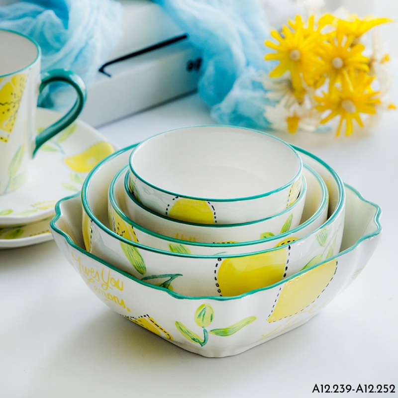 Bát ăn cơm, chén chè, bát tô ăn mì, thố đựng salad hoạ tiết chanh vàng lá xanh Alifis