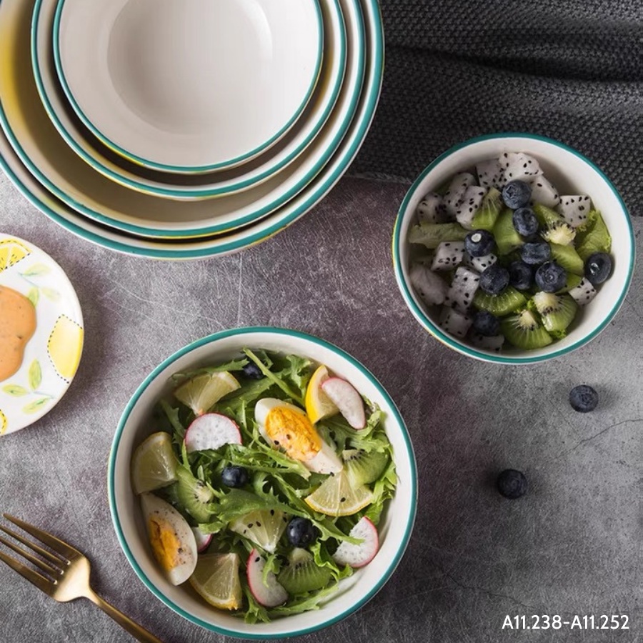 Giới thiệu Bát ăn cơm, chén chè, bát tô ăn mì, thố đựng salad hoạ tiết chanh vàng lá xanh Alifis