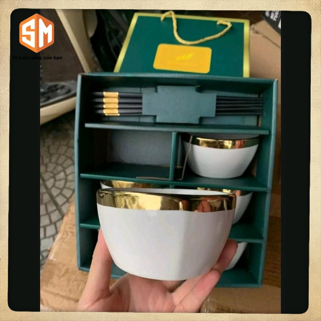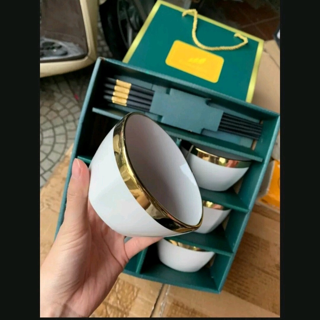 Bộ Bát / Bát ăn cơm Chén ăn cơm sứ Bộ bát quà tặng gốm sứ viền vàng cao cấp hộp đẹp tặng kèm 6 đôi đũa