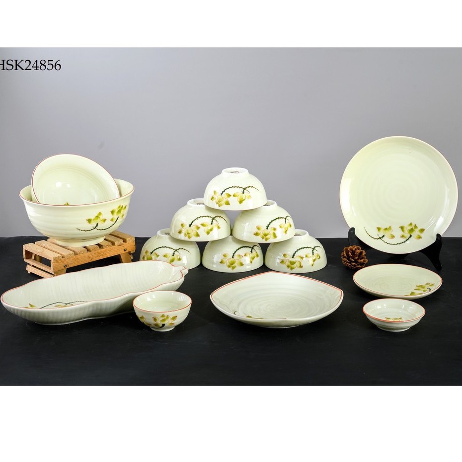 Bộ bát cơm chén cơm men kem họa tiết sen xanh vẽ tay gốm sứ Bát Tràng
