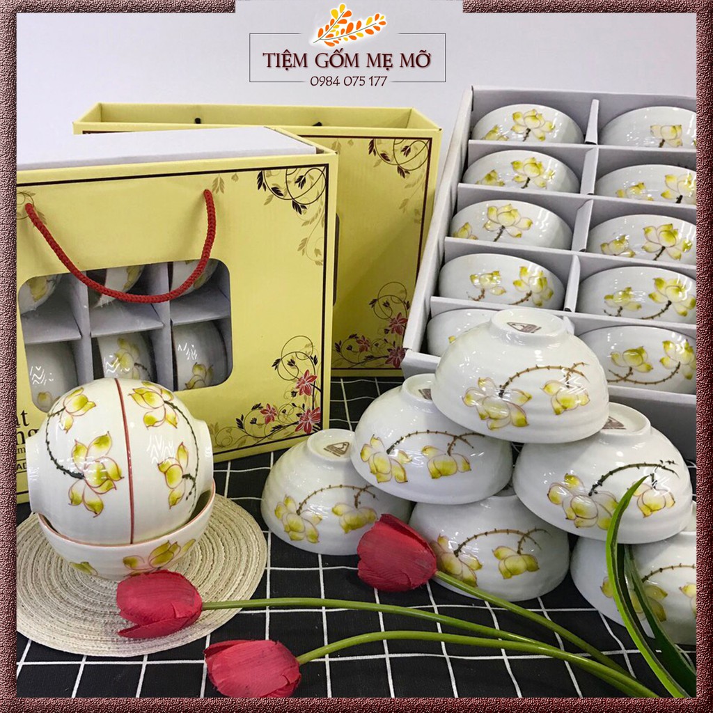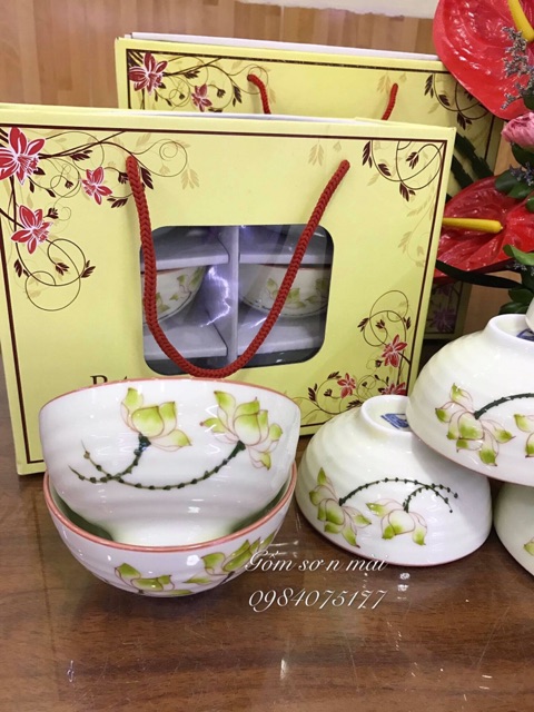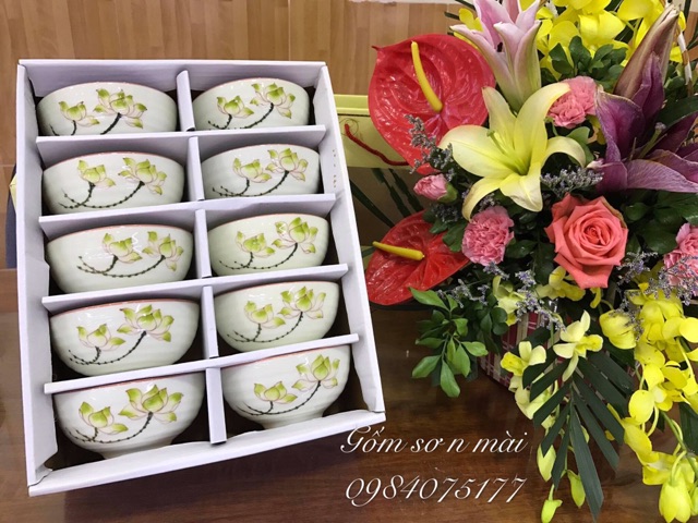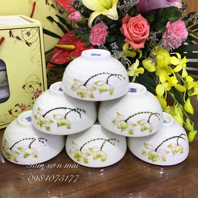 Giới thiệu Bộ bát cơm chén cơm men kem họa tiết sen xanh vẽ tay gốm sứ Bát Tràng