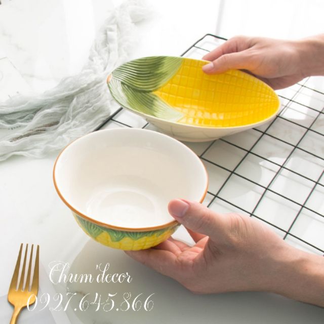 Bát, đĩa ăn trang trí hình bắp ngôChất liệu : gốm sứ