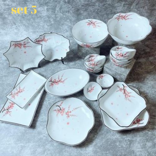 🍀 bao gồm; 2 tô canh phi 18 và 20, 6 bát cơm, 1 bát đựng mắm, 1 đĩa đựng muối ( đây là các sản phảm chắc chắn có trong set) | đĩa bầu dục múi phi 27, đĩa tròn phi 18-20, đĩa bầu dục trơn phi 27, đĩa vuông phi 18, đĩa lá bỏng 18x20, đĩa hoa phi 21, đĩa tam giác phi 20, đĩa sao phi 20, tô canh lượn phi 22, đĩa chữ nhật 25x30 ... từng set sẽ có những thứ khác nhau nên mọi người chọn cho kĩ nhé. ảnh set bát đĩa có như nào thì bạn sẽ nhận được như thế