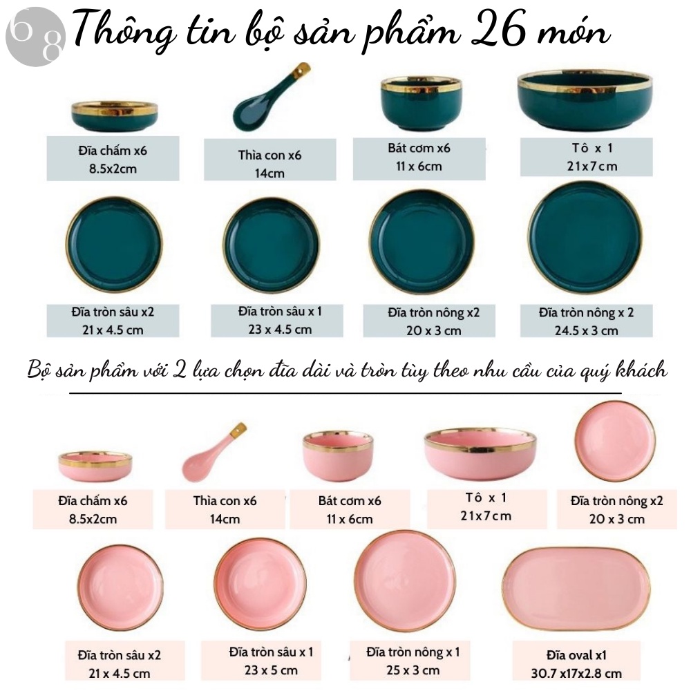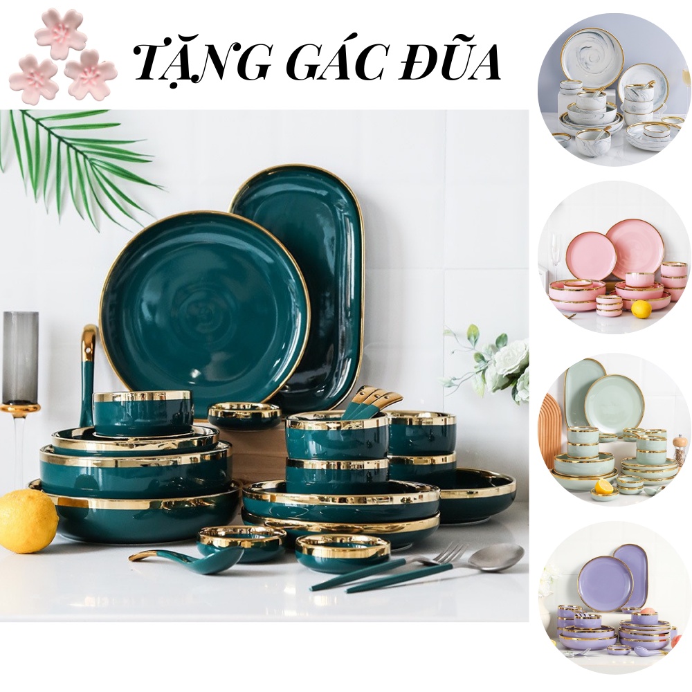 Nhà cửa & Đời sống > Bộ đồ bàn ăn > Tô || Bộ bát đĩa cao cấp,chén dĩa decor đẹp 26 món viền vàng các màu phong cách Bắc Âu (set dành cho 6 người )Còn hàng