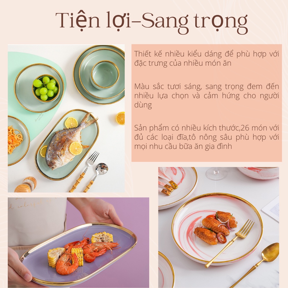 Giới thiệu Bộ bát đĩa cao cấp,chén dĩa decor đẹp 26 món viền vàng các màu phong cách Bắc Âu (set dành cho 6 người )