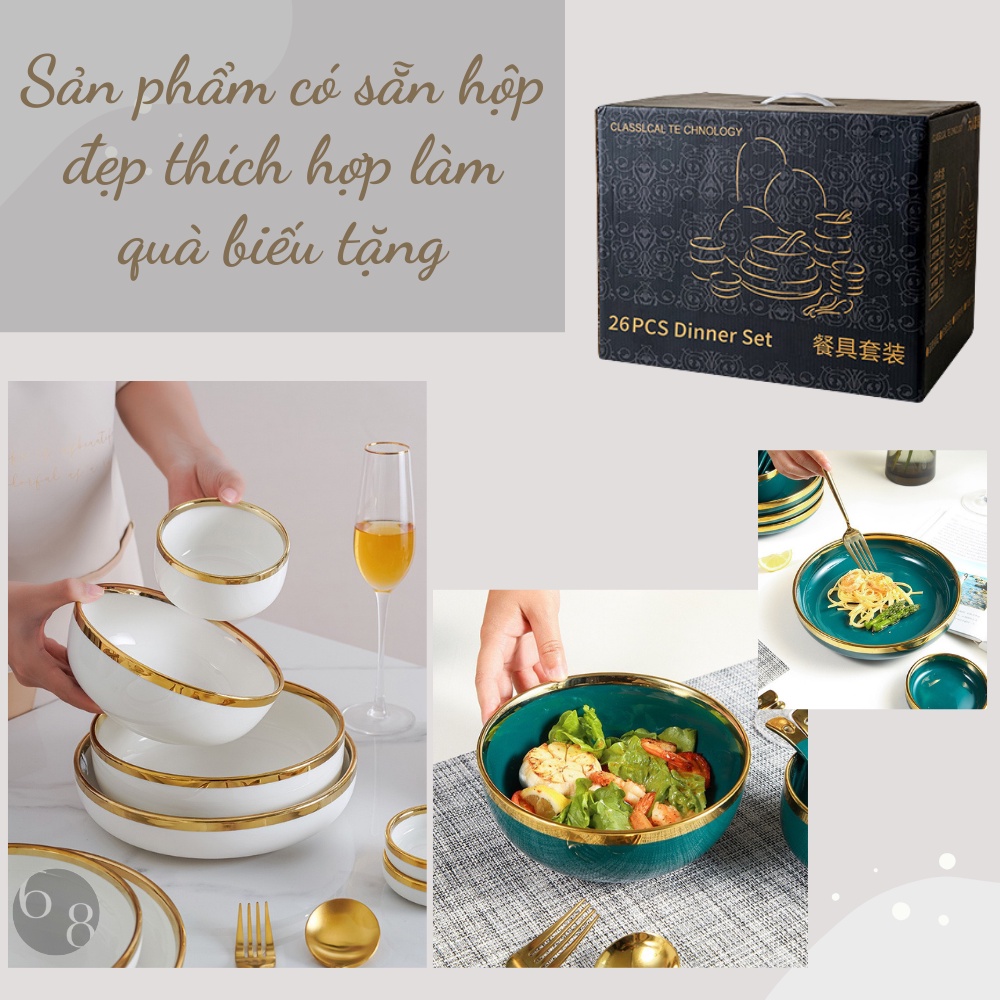 - Bộ bát đĩa đẹp,chén dĩa sứ 26 món viền vàng cao cấp phong cách Bắc Âu dành cho 6 người ăn