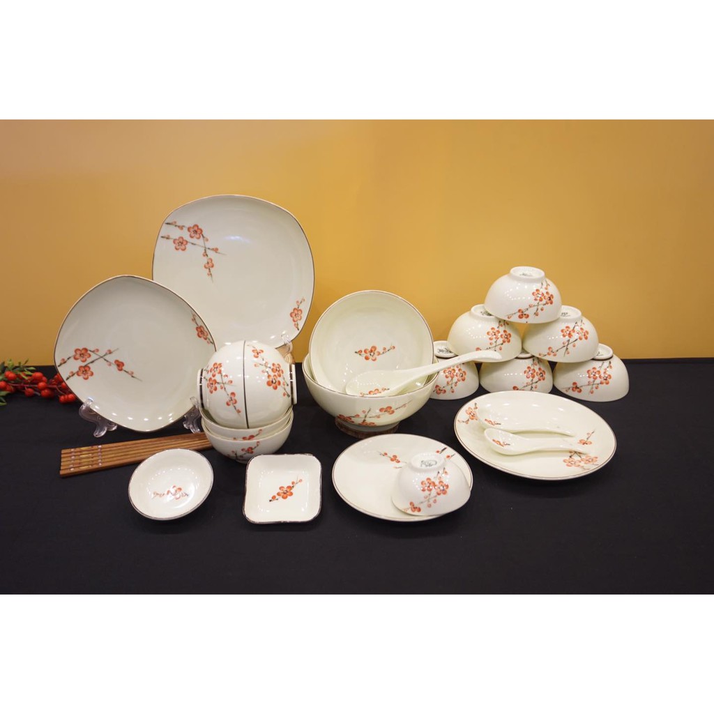 Bộ Bát Đĩa Đào Đỏ - Tô chén Ăn Cơm - Hàng Loại 1 - Gốm Sứ Bát Tràng