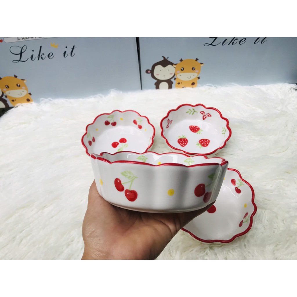 Tên Sản phẩm: Bát Đĩa Gốm Sứ Họa Tiết Trái Dâu Tây, Cherry