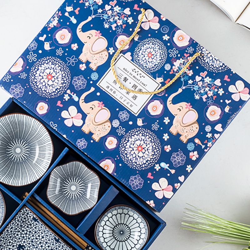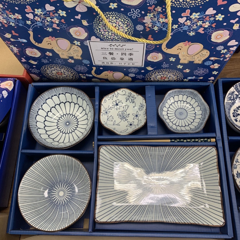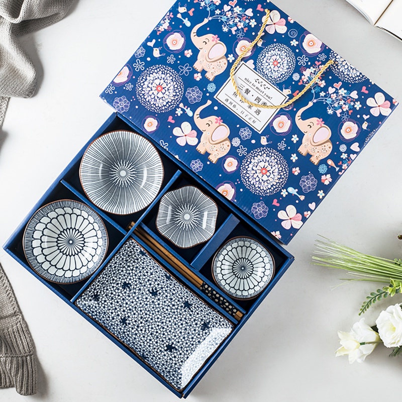 Bát đĩa - Set 7 món phong cách Nhật men lam - có hộp đi kèm xinh xắn phù hợp làm quà tặng - sang trọng tiện lợi