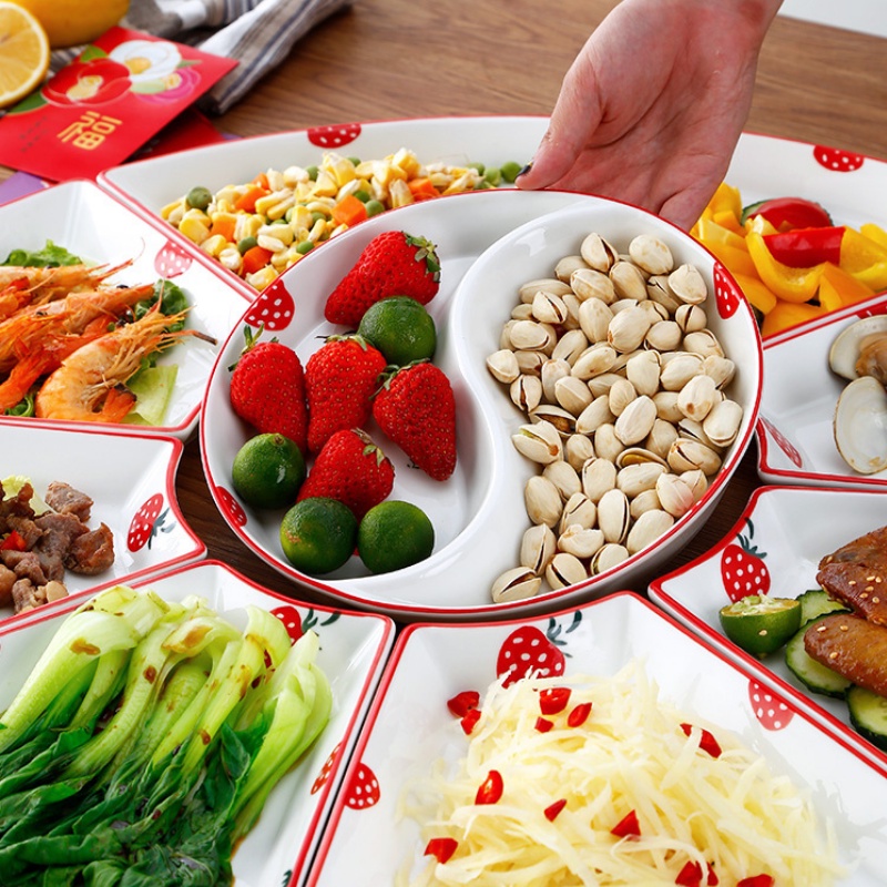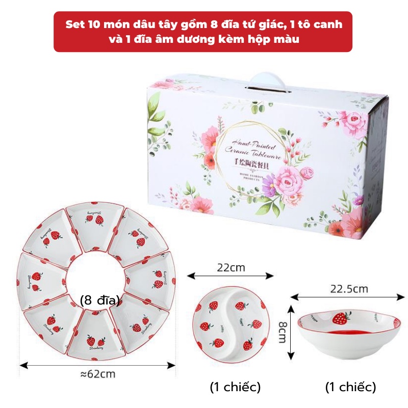 🌻 Tên sản phẩm: Set 10 món bát đĩa sứ họa tiết dâu tây đỏ phong cách Hàn Quốc - Phụ kiện bàn ăn