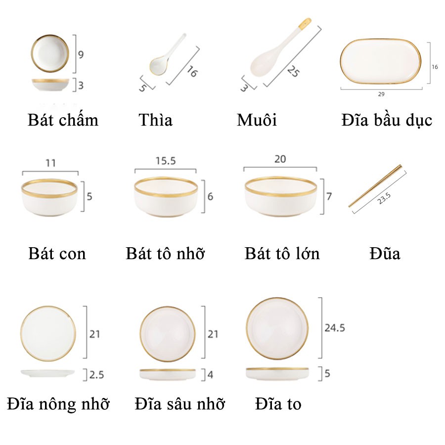 Set bát đĩa đẹp - đồ dùng phòng ăn sứ trắng viền vàng chất lượng caoGIỚI THIỆU:
