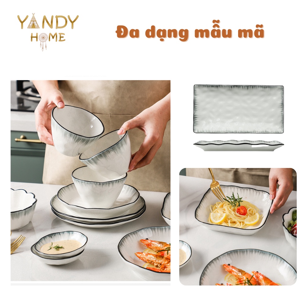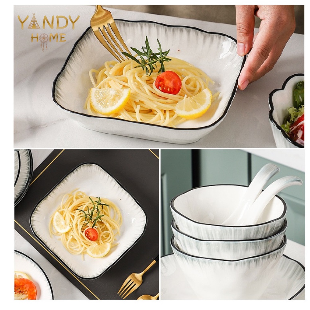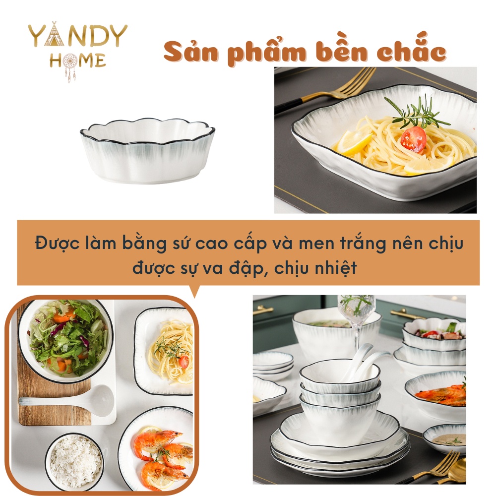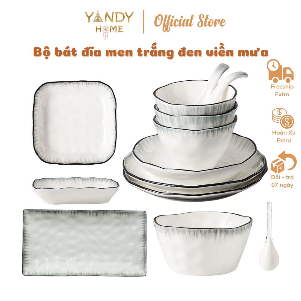 Bát đĩa tô chén gốm sứ YANDY HOME BB15 chất men cao cấp trắng đen viền mưa sang trọng siêu dày dặn