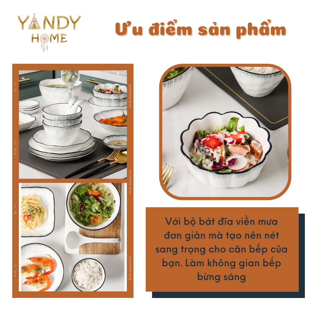 Bát đĩa sứ YANDY HOME BB15 chất men cao cấp trắng đen viền mưa, chén đĩa tô sứ sang trọng siêu dày dặnQUÝ KHÁCH CHỌN TỪNG MÓN KHI ĐẶT HÀNG.