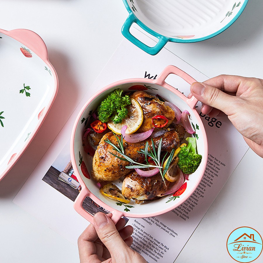 Nhà cửa & Đời sống > Dụng cụ nhà bếp > Lò nướng & phụ kiện || Bát nướng tròn, thố nướng chữ nhật có tay cầm họa tiết dâu tâyCòn hàng