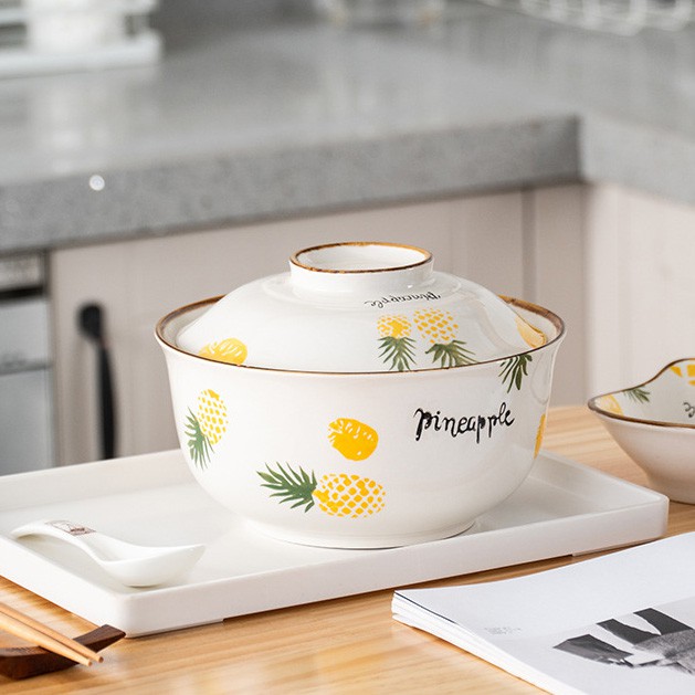 Nhà cửa & Đời sống > Bộ đồ bàn ăn > Dĩa || Bát sứ ăn mì có nắp họa tiết dứa, tem thư, củ lạc dễ thươngCòn hàng